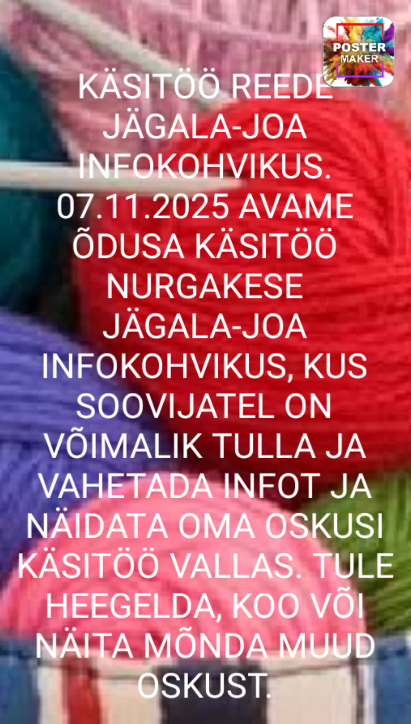 07.11.2025 AVAME ÕDUSA KÄSITÖÖ NURGAKESE JÄGALA-JOA INFOKOHVIKUS, KUS SOOVIJATEL ON VÕIMALIK TULLA JA VAHETADA INFOT JA NÄIDATA OMA OSKUSI KÄSITÖÖ VALLAS. TULE HEEGELDA, KOO VÕI NÄITA MÕNDA MUUD OSKUST.