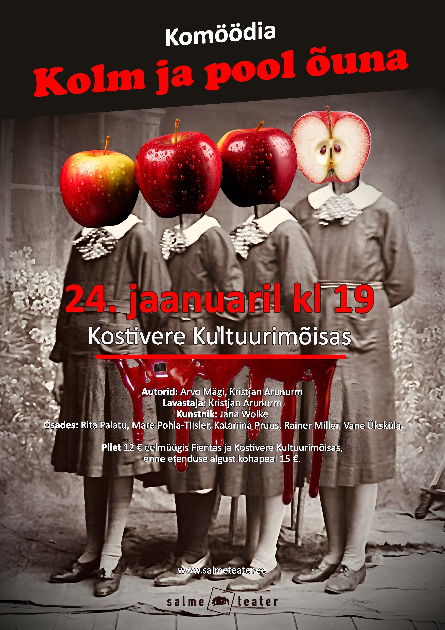 Pilet 12 € eelmüügis Fientas ja Kostivere Kultuurimõisas, enne etenduse algust kohapeal 15 €Salme Teater krimikomöödia „Kolm ja pool õuna“