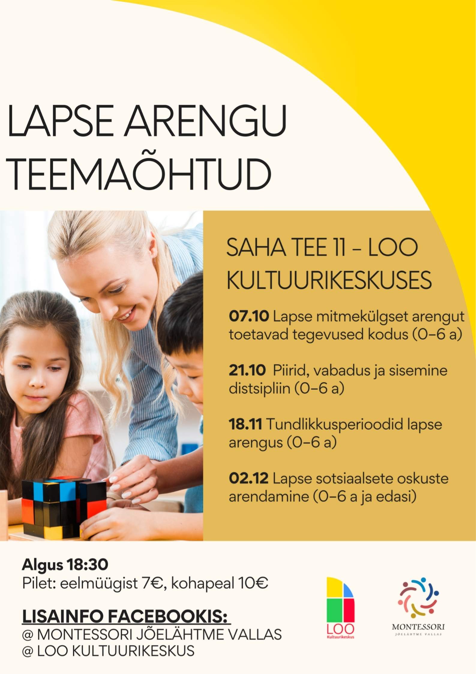 7€/10 €Kutsume lapsevanemaid ja huvilisi sügisel neljale teemaõhtule, kus arutleme, kuidas toetada laste loomulikku arengut, iseseisvust ja õpimotivatsiooni. Teemaõhtutel põimuvad teadmised Montessori pedagoogikast, igapäevaelu praktilised näited ja vanemate kogemuste jagamine.